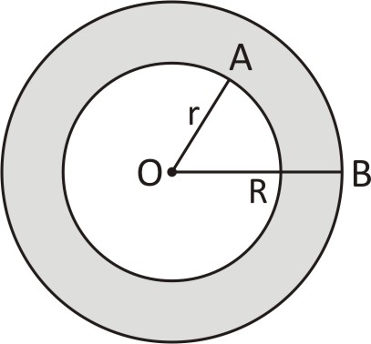 Given, ratio of their radii = 5 : 3 Let, R = radius of outer cirlce and r = radius of inner circle ∴ R = 5x and r = 3x And, Area enclosed between the circumference of two concentric circles = 16π cm ∴ π(R2 – r2) = 16π ⇒ (5x)2 – (3x)2 = 16 ⇒ 25x2 – 9x2 = 16 ⇒ 16x = 16 ⇒ x = 1 ∴ R = 5x = 5 × 1 = 5 cm ∴ Area of outer circle = πR2 = π × (5)2 = 25π cm2
