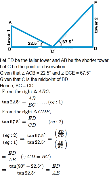 A person, standing exactly midway between two towers, observes the top of the two towers at angle of elevation of 22.5° and 67.5°. What is the ratio of the height of the taller tower to the height of the shorter tower? (Given that tan 22.5° = √2 - 1)