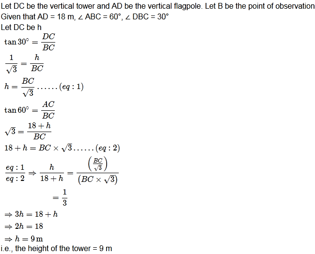 Multiple Choice Questions on A vertical tower stands on ground and is surmounted by a vertical flagpole of height 18 m At a point........... for Mathematics - All Exams Preparation