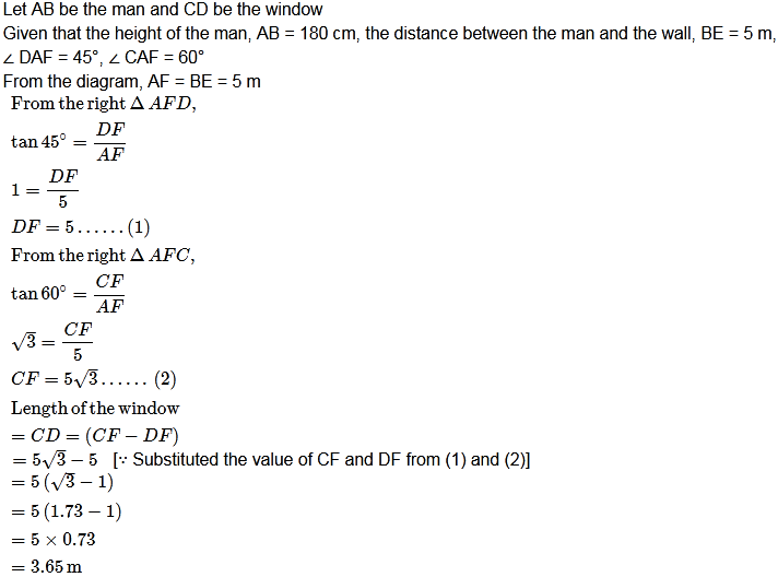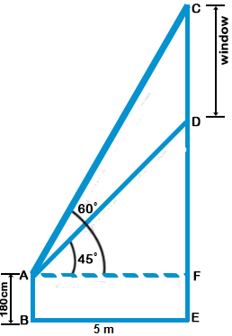 To a man standing outside his house, the angles of elevation of the top and bottom of a window are 60° and 45° respectively. If the height of the man is 180 cm and he is 5 m away from the wall, what is the length of the window?
