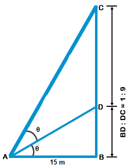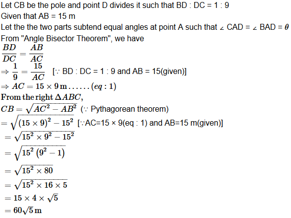 A vertical pole fixed to the ground is divided in the ratio 1 : 9 by a mark on it with lower part shorter than the upper part. If the two parts subtend equal angles at a place on the ground, 15 m away from the base of the pole, what is the height of the pole?
