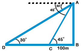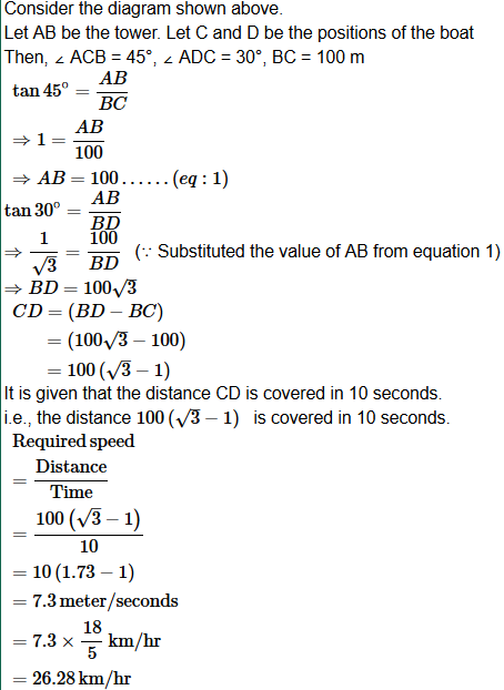 A man is watching from the top of a tower a boat speeding away from the tower. The boat makes an angle of depression of 45° with the man's eye when at a distance of 100 metres from the tower. After 10 seconds, the angle of depression becomes 30°. What is the approximate speed of the boat, assuming that it is running in still water?