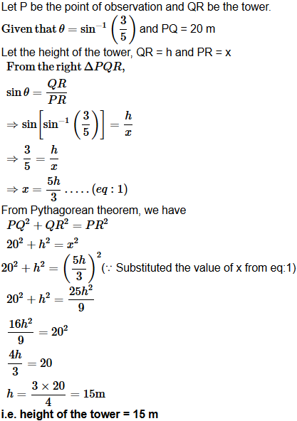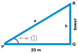 The angle of elevation of the top of the tower from a point on the ground is sin-1 (3/5). If the point of observation is 20 meters away from the foot of the tower, what is the height of the tower?