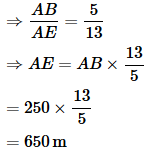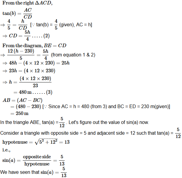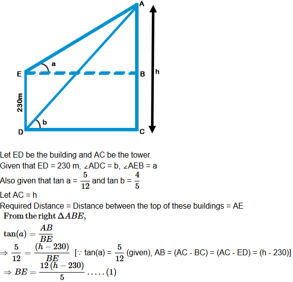 From the foot and the top of a building of height 230 m, a person observes the top of a tower with angles of elevation of b and a respectively. What is the distance between the top of these buildings if tan a = 5/12 and tan b = 4/5