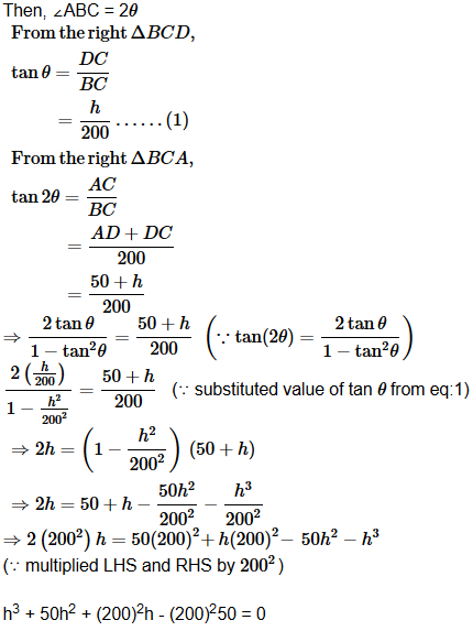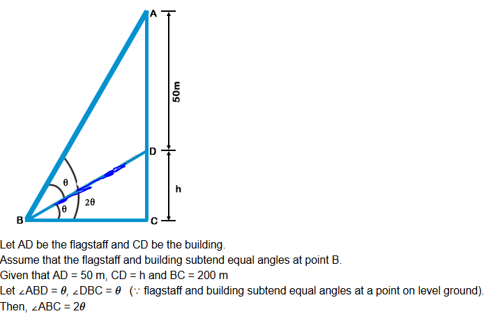 A flagstaff is placed on top of a building. The flagstaff and building subtend equal angles at a point on level ground which is 200 m away from the foot of the building. If the height of the flagstaff is 50 m and the height of the building is h, which of the following is true?