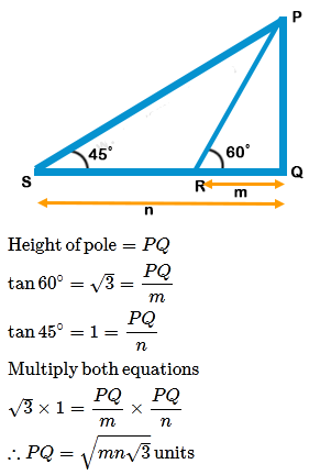Angles of elevation of pole are 60° and 45° from points at distances m and n on ground respectively. Here m, when measured from base of pole is less than n. What is the height of the pole?