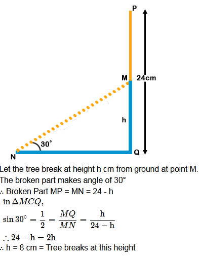 A tree breaks and falls to the ground such that its upper part is still partially attached to its stem. At what height did it break, if the original height of the tree was 24 cm and it makes an angle of 30° with the ground?