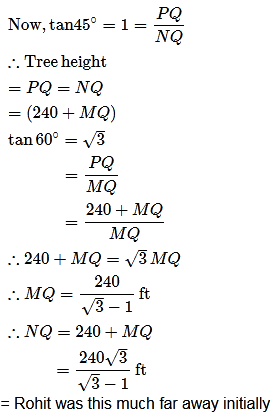 Rohit while seeing a bird on tree top made 45° angle of elevation. He walks 240ft. towards the tree to observe the bird closely, thus making 60° angle of elevation. How far was Rohit from the tree initially?
