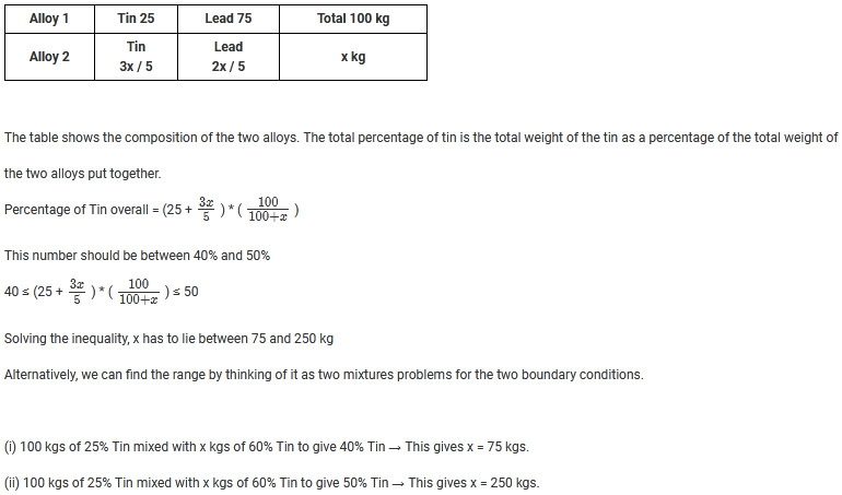 100 kgs of an alloy of tin and lead in the ratio 1:3 is mixed with x kgs of an alloy of tin and lead in the ratio 3:2. If the overall alloy should contain between 40% and 50% tin, what is the range of values x can take?