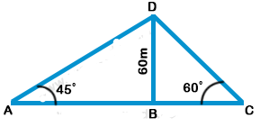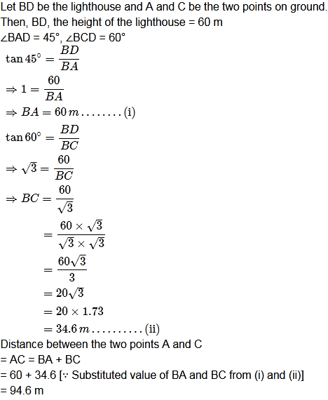The angle of elevation of the top of a lighthouse 60 m high, from two points on the ground on its opposite sides are 45° and 60°. What is the distance between these two points?