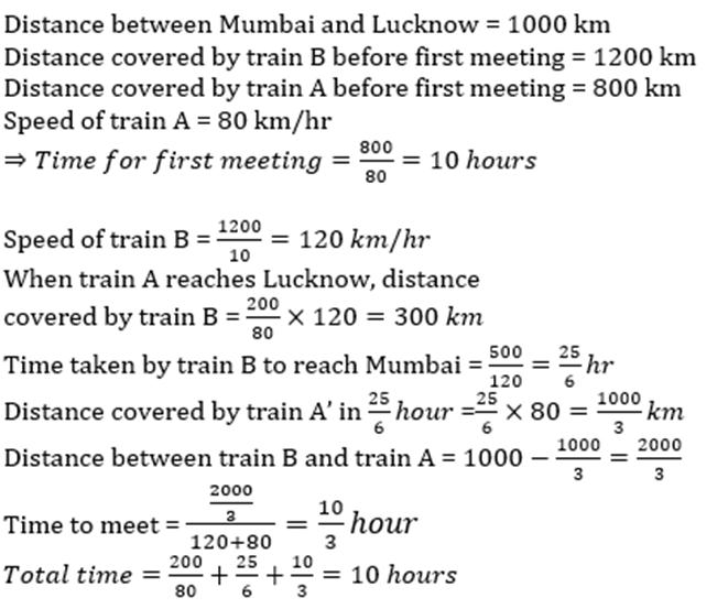 Train A and train B start from Mumbai for Lucknow. Train B reaches first at Lucknow and meets train A in between the way, which is 200 km from Lucknow. Find after how much time they will meet second time after first time meeting if both trains continue, their to and fro motion.