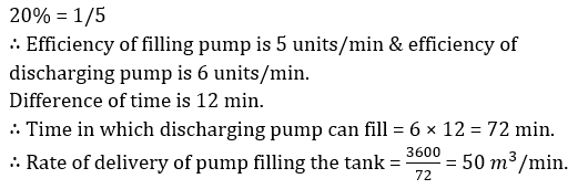 Question 2. A tank of 3600 cu m capacity is being filled with water. The delivery of the pump discharging the tank is 20% more than the delivery of the pump filling the same tank. As a result, twelve minutes more time is needed to fill the tank than to discharge it. Determine the rate of delivery of the pump filling the tank.