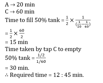 Question 4. Tap A fills a tank in 20 minutes while C empties it at 1/3rd the rate at which A fills it. At 12 : 00 noon, A and C are simultaneously started and when the tank is 50% full, tap A is turned off. At what time will the tank be empty?