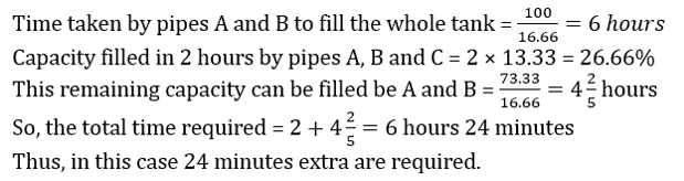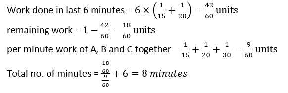 Question 7. Three pipes A, B and C can fill a tank in 15 minutes, 20 minutes and 30 minutes respectively. All three pipes started to fill the tank at same time. The pipe C is closed 6 minutes before the tank is filled. In what time the tank will be full?