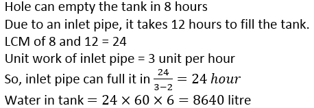 Question 8. There is a hole in a water tank which can empty it in 8 hours. A pipe is opened which fills 6 litre water per minute in tank and now tank is emptied in 12 hours. What is the capacity of the tank?