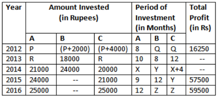 Directions : Study the following table carefully and answer the questions that follow: Three persons A, B, C invested different amounts in different years for different time period and shared profit from total profit given as per table. Some values are missing. Answer the questions on the basis of given table and information in question.
