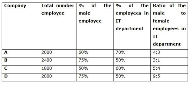Direction: The given table shows the number of employees in four different companies and the percentage of male, ratio of the male to female employees in IT department. The companies have two different departments IT and HR.