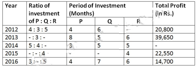 Let investment of R is 4x, and months of investment of P = Q = y months So ratio of profit share of P : Q : R is 3900*y : 2600*y = 4x*4 975y : 650y : 4x So (975y-650y)/(975y+650y+4x) * 22550 = 2750 325y/(1625y+4x) = 2750/22550 1625y + 4x = 2665y 4x = 1040y So y/4x = 1/1040