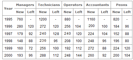 DIRECTION(6-10) The following table shows the number of new employees added to different categories of employees in a company and also the number of employees from these categories who left the company every year