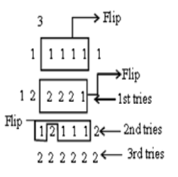 Six identical cards are placed on a table. Each card has number '1' marked on one side and number '2' marked on its other side. All the six cards are placed in such a manner that the number '1' is on the upper side. In one try, exactly four (neither more nor less) cards are turned upside down. In how many least number of tries can the cards be turned upside down such that all the six cards show number '2' on the upper side ?