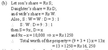 A man divides his property so that his son’s share to his wife’s share and the wife’s share to his daughter’s share are both in the ratio 3 : 1. If the daughter gets Rs 10,000 less than the son, find the total worth of the property.