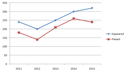 Number of students who could pass the exam in the year 2016 = 110% of 240 = 264 75% of x = 264 x = 264 × 100/75 = 352