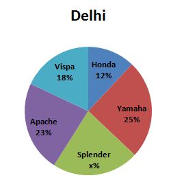 Honda 9% = 1350 Yamaha 28%=4200 Splender 27%=4050 Apache 21%=3150 Vispa 15%=2250