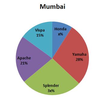 The pie-charts show the % of registration of different types of bikes in Mumbai and Delhi.Total no of bikes registered in Mumbai and Delhi is 15,000 and 35000