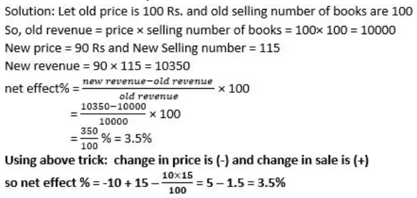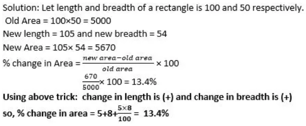 1. A+B+AB/100 When A and B both are a positive change 2. A-B-AB/100 When A is positive change and B is a negative change 3. -A+B-AB/100 When A is negative change and B is a positive change. 4. -A-B+AB/100 When A and B both are a negative change. Important: There is no need to remember the above formulas, you have to just remember ±A ± B ±AB/100 and put the sign of change, if negative, then (-) and positive then, (+) but keep in mind that sign of AB is the product of signs of A and B. Example1: The price of a book is reduced by 10% and the sale of the book is increased by 15%. Find the net effect on revenue. Example 2: If length and breadth of a rectangle is increased by 5% and 8% respectively. Find the % change in area of the rectangle.