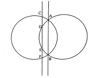 Two circles intersect each other at the point A and B, A straight line parallel to AB intersects the circles at C, D, E and F. If CD = 4.5 cm, then the measure of EF is