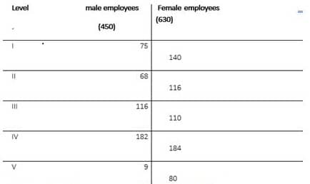 The ratio of male to female employees in an organization is 5 : 7. All employees of the organization work at different levels. (Level- I, II, III, IV, V). 16 2/3% of the male employees work at level I. The difference between male employees working at level II and male employees working at level IV is 114, while the sum of the same is 250. (male employees at level II < male employees at level IV). 9 male employees work at level V, which is 2% of the total number of male employees. remaining male employees work at level III. 22 2/9% of the female employees work at level I. The no. Female employees working at level II is 6 more than the no. of female employees working at level III. The number of female employees working at level IV is 2 more than the number of male employees at the same level. The number of female employees working at level V is 57 1/7% of the female employees working at level I.