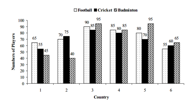 Three different bars represent three different games: Football, Cricket, and Badminton . On the X-axis, we have a number of countries from 1 to 6 . On the Y-axis we have the number of players . The length of the Bars denotes the number of players .