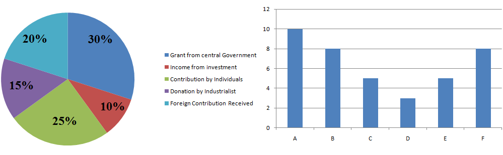 The pie-chart shows sources of income for an NGO. The total income is Rs.40 crore. The bar chart gives the expenditure incurred on various items A – Food for poor, B – Education to illiterate, C – Mid-day deal programme, D – General Expenses, E – Eye Camp expenses, F – Integrated Street Children Programme.(in Crores)