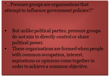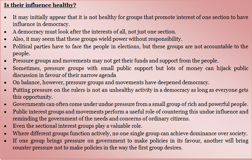 Pressure groups and movements exert influence on politics in a variety of ways: