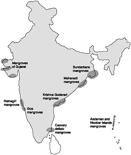 Mangroves are salt tolerant forest ecosystem found mainly in the tropical and sub-tropical inter-tidal regions of the world. They are reservoirs of a large number of plant and animal species associated together over a long evolutionary period and exhibiting remarkable capacity for salt tolerance. They stabilize the shoreline and act as a bulwark against encroachments by the sea. India harbours some of the best mangroves in the world and these occur all along the Indian coastline in sheltered estuary, tidal creeks, backwaters, salt marshes and mud flats covering a total area of 4,827sq km. Under the scheme on Conservation and Management of Mangroves, 15 mangrove areas have been identified for intensive conservation and management purposes: Northern Andaman and Nicobar, Sunderbans (West Bengal), (Orissa), Pitchavaram and Point Calimer (Tamil Nadu), Goa, Gulf of Kutch (Gujarat), Coondapur (Karnataka), Achra/Ratnagiri (Maharashtra) and Vembanad (Kerla). Management action plans for all the 15 mangrove areas have been sanctioned.