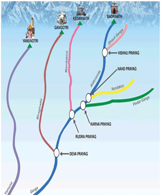 The two streams now become one and go ahead. Next headstream is Nandakini, which meets Alaknanda at Nandaprayag. From here, the Alaknanda river becomes mighty and now meetsNanda River at Karnaprayag. After Karnaprayag, the Mandakini river meets this stream and it is called Rudraprayag. Finally, the Alaknanda meets Bhagirathi at Devprayag and from here, it is called Ganga.