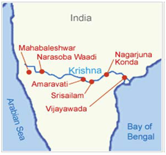 India. It is the fourth largest river in India after the Ganga, Godavari and the Narmada. Krishna River rises at Mahabaleswar in district Satara, Maharashtra in the west and meets the Bay of Bengal at Hamasaladeevi in Andhra Pradesh, on the east coast. It flows through Mhraharastra, Andhra Pradesh and Karnataka. The delta of this river is one of the most fertile regions in India and was the home to ancient Satavahana and Ikshvaku Dynasty kings. Vijayawada is the largest city on the River Krishna.
