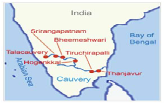 Kaveri or Cauvery flows in Karnataka and Tamil Nadu. The river covers a distance of about 765 km