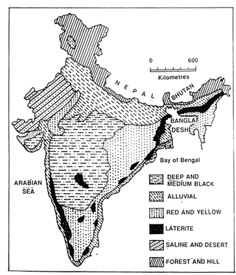 Considering variation of texture, structure, color, constituent minerals, the soils of India, are generally sub-divided into sight broad groups. These are :