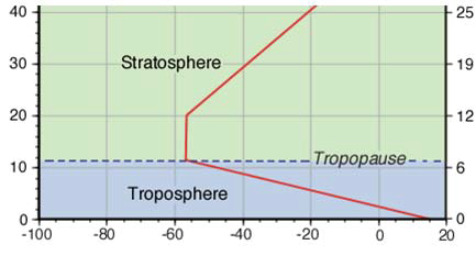 The boundary between troposphere and stratosphere, called the tropopause, is a temperature inversion. Tropopause refers to the altitude at which the fall in the temperature is stalled. This layer separates the troposphere from the stratosphere (the second layer of the atmosphere). This layer is usually quiet and no major movement of air takes place in it. Its height at Tropic of Cancer and