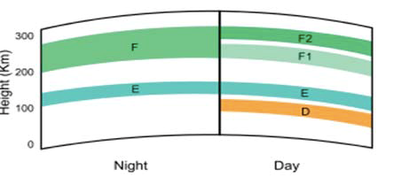 Accordingly, Ionosphere has been divided into different sets of layers during day and night which are shown in this graphic: