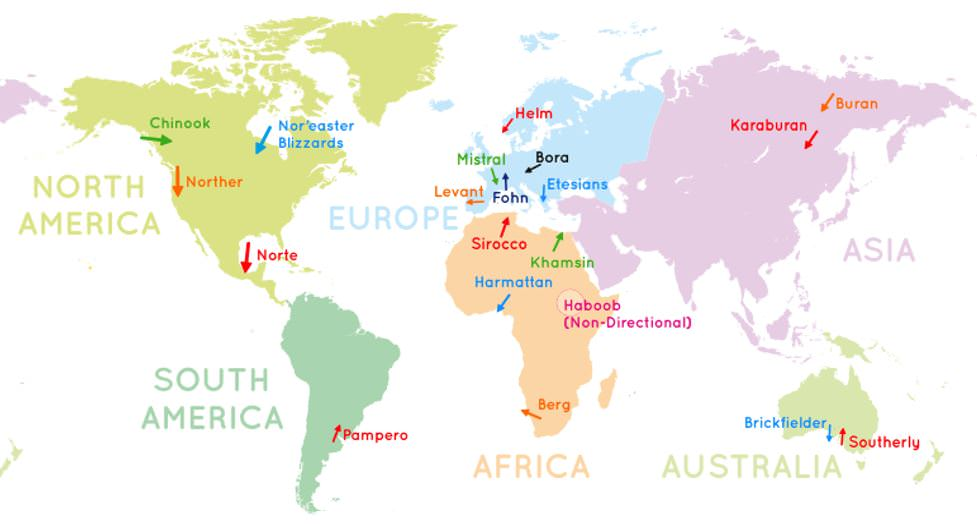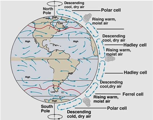 The general circulation of the Earth’s atmosphere is driven by solar energy, which falls preferentially in equatorial latitudes. Atmospheric redistribution of heat pole ward is strongly affected by the Earth’s rapid rotation and the associated Coriolis force at non-equatorial latitudes (which adds an east-west component to the direction of the winds), resulting in about three latitudinal cells of circulation in each hemisphere. Instabilities produce the characteristic high-pressure areas and low-pressure storms of the mid-latitudes as well as the fast, eastward-moving jet streams of the upper troposphere that guide the paths of storms.