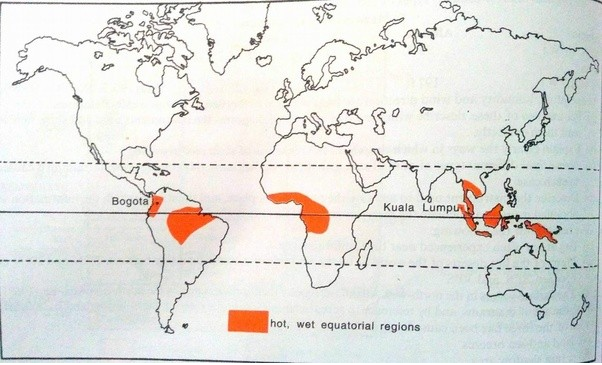 Over equatorial regions, where the surface is being heated strongly throughout the year and air warmed by contact with it is expanding and rising, the air all the way up to the tropopause is less dense than air to the north and south. Thus, density of the air is maximum at the equator. But here,you must note that almost same amount of atmospheric mass exists at both equator and poles but only the density of the air is less at equator and greater at poles