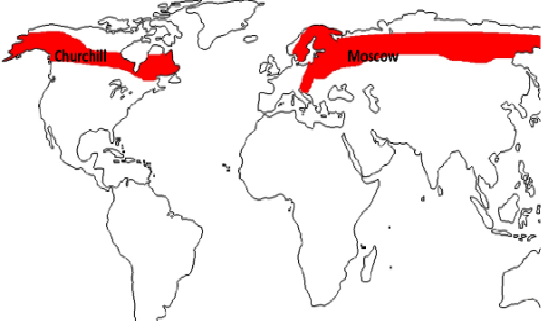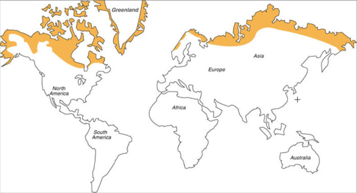 Mainly regions north of the Arctic Circle in the Northern Hemisphere