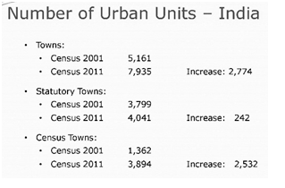 [4] At the 1961 Census, the concept of 'Town Group' was adopted to obtain a broad picture relating to urban spread. This was refined in 1971 with the concepts of 'Urban Agglomeration' to obtain better feed back in regard to urban contiguity, processes and trends of urbanisation and other related matters.