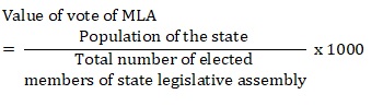 On the basis of the above formula, the value of the vote of an M.L.A. from U.P. has the highest value and that of Sikkim the lowest. The formula adopted to secure uniformity between all the States on one hand and the Parliament on the other is as follows: