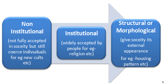 First, on the one extreme are structural or morphological social phenomena. They make up the substratum of collective life. By this he meant the number and nature of elementary parts of which society is composed, the way in which the morphological constituents are arranged. In this category of social facts are included: the distribution of population over the surface of the territory, the forms of dwellings, nature of communication system etc.
