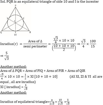 Multiple Choice Questions on PQR is an equilateral triangle whose side is 10 cm What is the value in cm of the inradius of triang........... for SSC CGL Exam Preparation