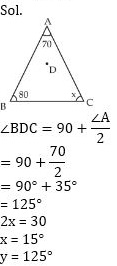 In a triangle ABC, ?A = 70°, ?B = 80° and D is the incentre of ?ABC. ?ACB = 2x° and ?BDC = y°. The values of x and y, respectively are