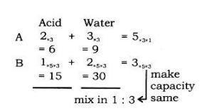 Two bottles contain acid and water in the ratio 2 : 3 and 1 : 2 respectively. These are mixed in the ratio 1 : 3. What is the ratio of acid and water in the